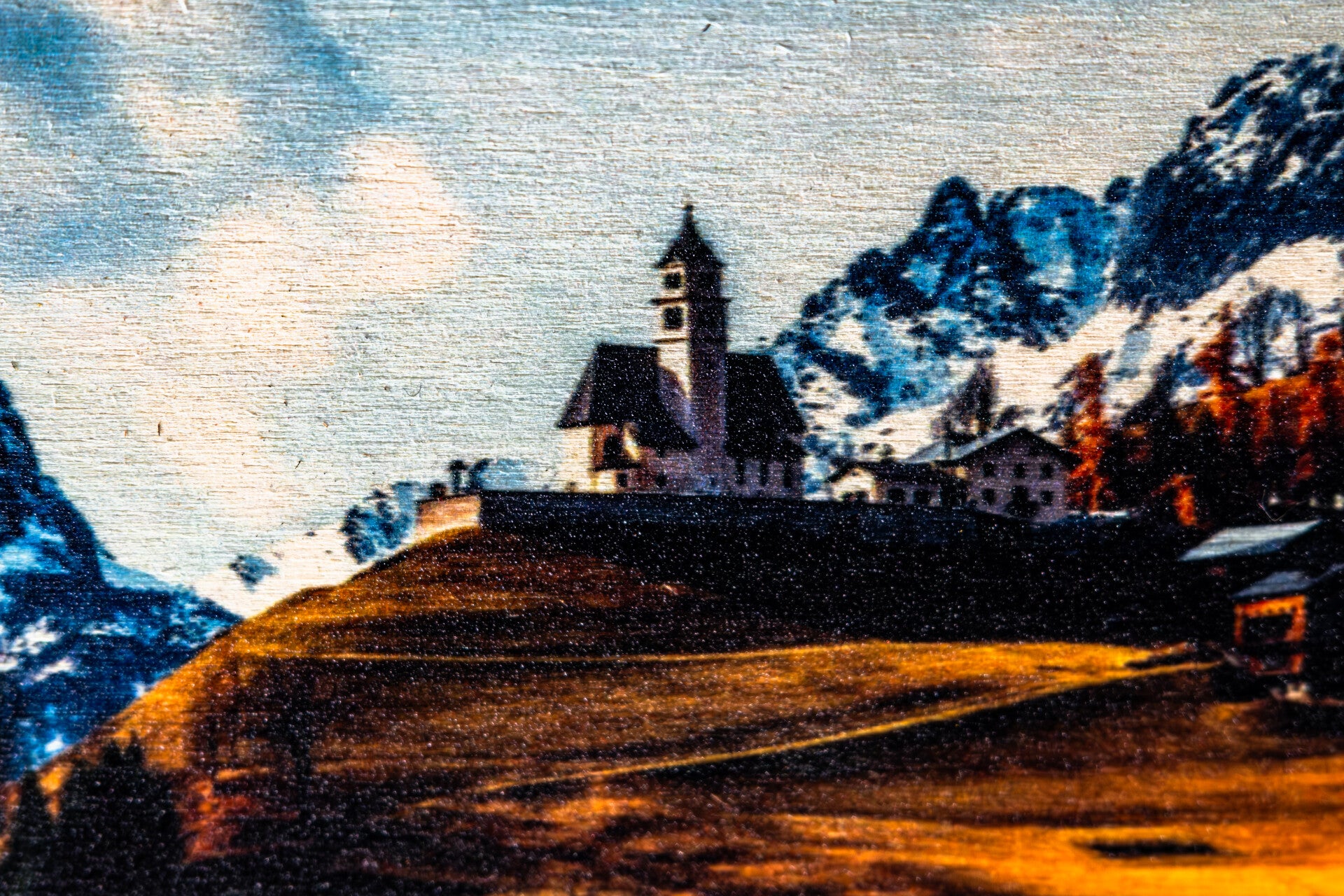 The print is mounted on a natural wood panel, whose layered structure and visible grain give the artwork a warm, tactile, and authentic character.